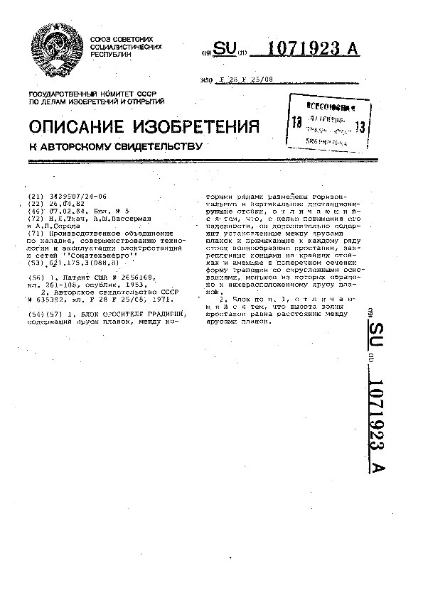 Блок оросителя градирни / Ткач Н. Я., Вассерман А. Ш., Середа А. П.; заявитель: Производственное объединение по наладке, совершенствованию технологии и эксплуатации электростанций и сетей "Союзтехэнерго" // Описания изобретений (ретрофонд) / Комитет по патентам и товарным знакам России. – М. — (Патенты России)., 2003. – 1984, № 1. — Загл. с титул. экрана. — Поисковая система: ИПС MIMOSA GTI. — Систем. требования: Acrobat Reader. — Режим доступа: ftp://smolensklib.ru/bd/patent_ru/pt1071923.pdf. — <URL:ftp://smolensklib.ru/bd/patent_ru/pt1071923.pdf>.