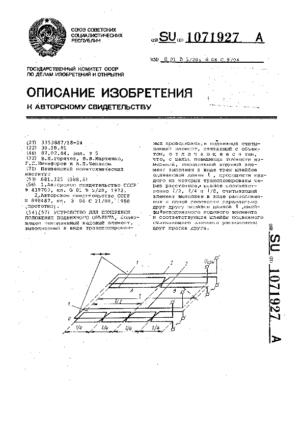 Устройство для измерения положения подвижного объекта / Гоячев В. Я.. Марченко В. В., Никифоров Г. С., Чепасов А. П.; заявитель: Пензенский политехнический институт // Описания изобретений (ретрофонд) / Комитет по патентам и товарным знакам России. – М. — (Патенты России)., 2003. – 1984, № 1. — Загл. с титул. экрана. — Поисковая система: ИПС MIMOSA GTI. — Систем. требования: Acrobat Reader. — Режим доступа: ftp://smolensklib.ru/bd/patent_ru/pt1071927.pdf. — <URL:ftp://smolensklib.ru/bd/patent_ru/pt1071927.pdf>.