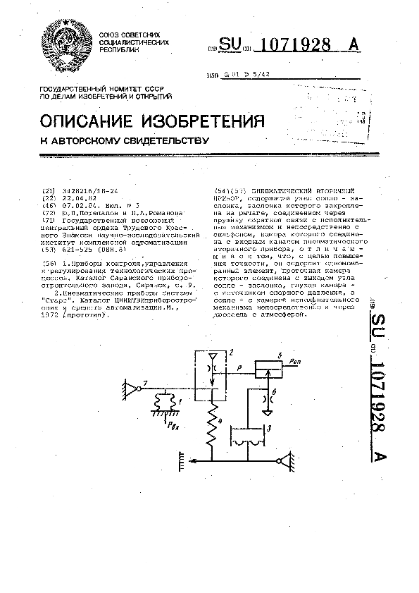 Пневматический вторичный прибор / Потепалов Ю. Н., Романова Н. А.; заявитель: Государственный всесоюзный центральный ордена Трудового Красного Знамени научно-исследовательский институт комплексной автоматизации // Описания изобретений (ретрофонд) / Комитет по патентам и товарным знакам России. – М. — (Патенты России)., 2003. – 1984, № 1. — Загл. с титул. экрана. — Поисковая система: ИПС MIMOSA GTI. — Систем. требования: Acrobat Reader. — Режим доступа: ftp://smolensklib.ru/bd/patent_ru/pt1071928.pdf. — <URL:ftp://smolensklib.ru/bd/patent_ru/pt1071928.pdf>.