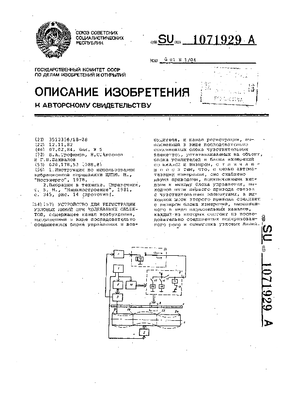 Устройство для регистрации узловых линий при колебаниях объектов / Трофимов В. А., Аксенов Н. С., Бахвалов Г. Н. // Описания изобретений (ретрофонд) / Комитет по патентам и товарным знакам России. – М. — (Патенты России)., 2003. – 1984, № 1. — Загл. с титул. экрана. — Поисковая система: ИПС MIMOSA GTI. — Систем. требования: Acrobat Reader. — Режим доступа: ftp://smolensklib.ru/bd/patent_ru/pt1071929.pdf. — <URL:ftp://smolensklib.ru/bd/patent_ru/pt1071929.pdf>.