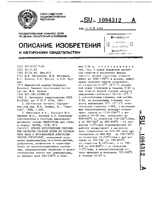 Способ изготовления постоянных магнитов сложной формы из сплавов типа ЮНДК с направленной кристаллической структурой / Изгородин А. К., Коноплев Ю. В., Власов В. Г. [и др.]; заявитель : Ивановский ордена Трудового Красного Знамени текстильный институт им. М. В. Фрунзе // Описания изобретений (ретрофонд) / Комитет по патентам и товарным знакам России. – М. — (Патенты России)., 2003. – 1984, № 1. — Загл. с титул. экрана. — Поисковая система: ИПС MIMOSA GTI. — Систем. требования: Acrobat Reader. — Режим доступа: ftp://smolensklib.ru/bd/patent_ru/pt1084312.pdf. — <URL:ftp://smolensklib.ru/bd/patent_ru/pt1084312.pdf>.