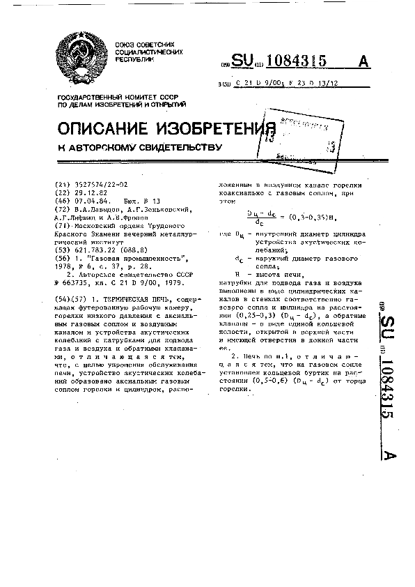 Термическая печь / Давыдов В. А., Зеньковский А. Г., Лифшиц А. Г., Фролов А. В.; заявитель : Московский ордена Трудового Красного Знамени вечерний металлургический институт // Описания изобретений (ретрофонд) / Комитет по патентам и товарным знакам России. – М. — (Патенты России)., 2003. – 1984, № 1. — Загл. с титул. экрана. — Поисковая система: ИПС MIMOSA GTI. — Систем. требования: Acrobat Reader. — Режим доступа: ftp://smolensklib.ru/bd/patent_ru/pt1084315.pdf. — <URL:ftp://smolensklib.ru/bd/patent_ru/pt1084315.pdf>.
