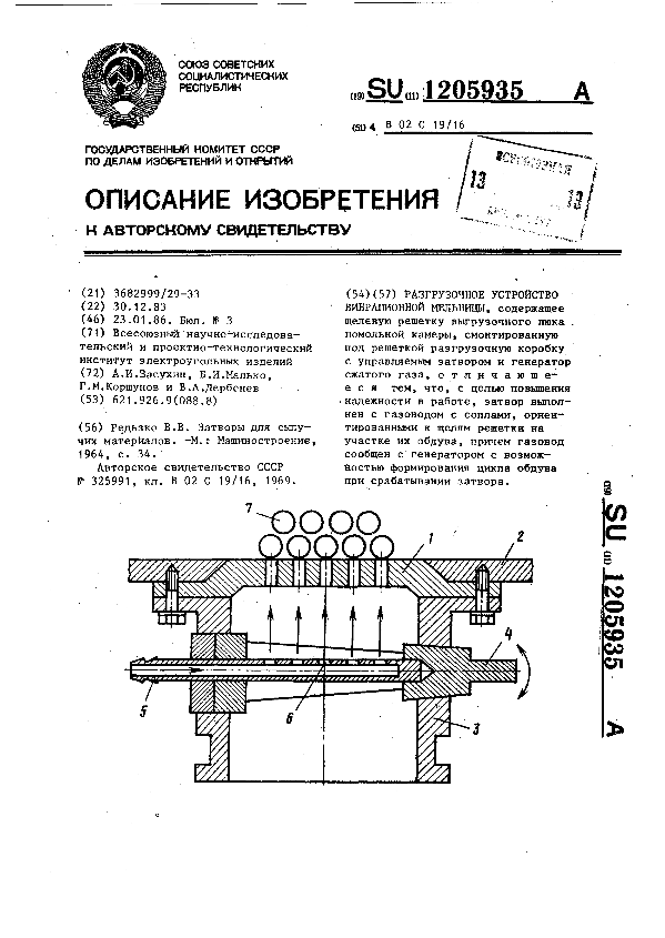 Разгрузочное устройство вибрационной мельницы / Засухин А. И., Малько Б. И., Коршунов Г. М. [и др.]; заявитель: Всесоюзный научно-исследовательский и проектно-технологический институт электроугольных изделий // Описания изобретений (ретрофонд) / Комитет по патентам и товарным знакам России. – М., 2003. – 1986, № 1. — (Патенты России). — Загл. с титул. экрана. — Поисковая система: ИПС MIMOSA GTI. — Систем. требования: Acrobat Reader. — Режим доступа: ftp://smolensklib.ru/bd/patent_ru/pt1205935.pdf. — <URL:ftp://smolensklib.ru/bd/patent_ru/pt1205935.pdf>.