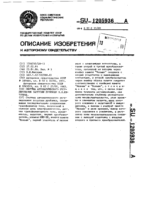 Система автоматического регулирования загрузки дробилки В. И. Янтурина / Янтурин В. И. // Описания изобретений (ретрофонд) / Комитет по патентам и товарным знакам России. – М., 2003. – 1986, № 1. — (Патенты России). — Загл. с титул. экрана. — Поисковая система: ИПС MIMOSA GTI. — Систем. требования: Acrobat Reader. — Режим доступа: ftp://smolensklib.ru/bd/patent_ru/pt1205936.pdf. — <URL:ftp://smolensklib.ru/bd/patent_ru/pt1205936.pdf>.