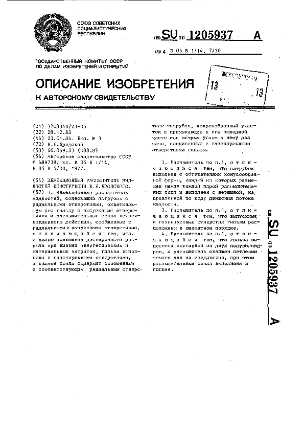Инжекционный распылитель жидкостей конструкции В.Н.Бродского / Бродский В. Н. // Описания изобретений (ретрофонд) / Комитет по патентам и товарным знакам России. – М., 2003. – 1986, № 1. — (Патенты России). — Загл. с титул. экрана. — Поисковая система: ИПС MIMOSA GTI. — Систем. требования: Acrobat Reader. — Режим доступа: ftp://smolensklib.ru/bd/patent_ru/pt1205937.pdf. — <URL:ftp://smolensklib.ru/bd/patent_ru/pt1205937.pdf>.