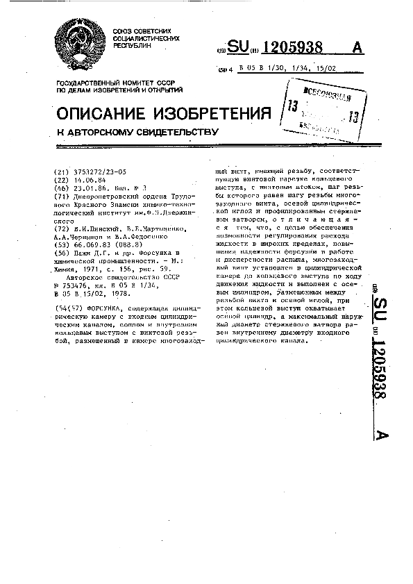 Форсунка / Пинский В. И., Мартыненко В. Е., Чернышов А. А. [и др.]; заявитель: Днепропетровский ордена Трудового Красного Знамени химико-технологический институт им. Ф. Э. Дзержинского // Описания изобретений (ретрофонд) / Комитет по патентам и товарным знакам России. – М., 2003. – 1986, № 1. — (Патенты России). — Загл. с титул. экрана. — Поисковая система: ИПС MIMOSA GTI. — Систем. требования: Acrobat Reader. — Режим доступа: ftp://smolensklib.ru/bd/patent_ru/pt1205938.pdf. — <URL:ftp://smolensklib.ru/bd/patent_ru/pt1205938.pdf>.