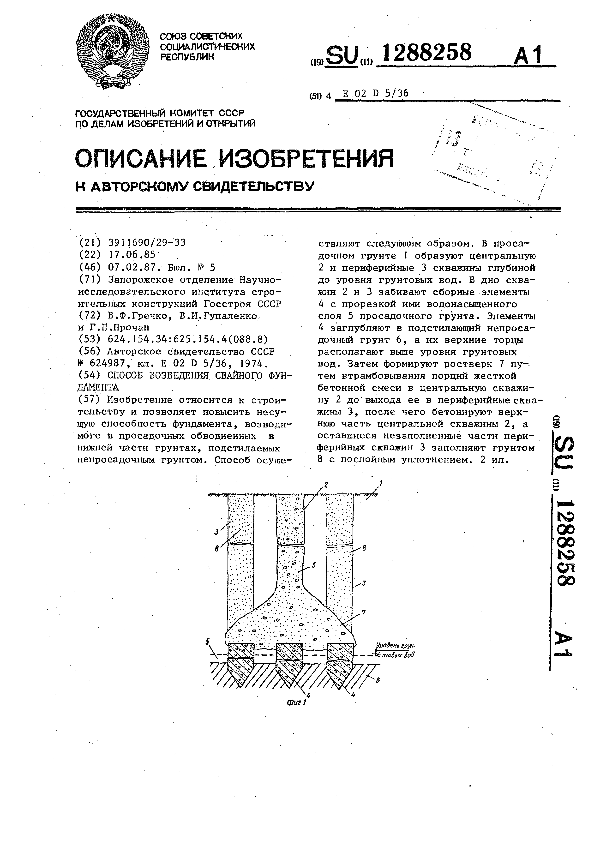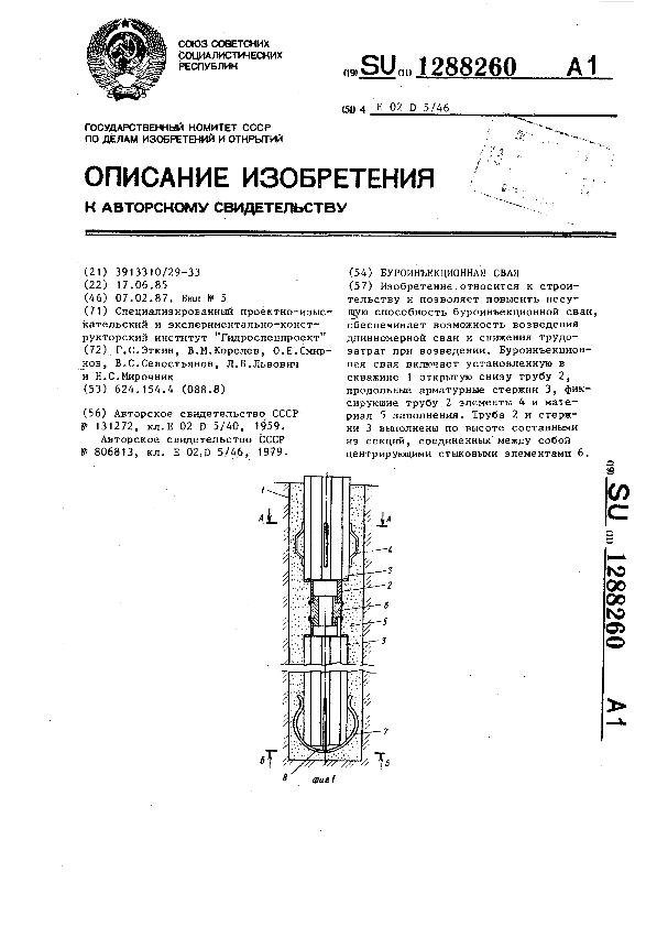 Буроинъекционная свая / Эткин Г. С., Королев В. М., Смирнов О. Е. [и др.]; заявитель: Специализированный проектно-изыскательский и экспериментально-конструкторский институт "Гидроспецпроект" // Описания изобретений (ретрофонд) / Комитет по патентам и товарным знакам России. – М., 2003. – 1987, № 1. — (Патенты России). — Загл. с титул. экрана. — Поисковая система: MIMOSA GTI. — Систем. требования: Acrobat Reader. — Режим доступа: ftp://smolensklib.ru/bd/patent_ru/pt1288260.pdf. — <URL:ftp://smolensklib.ru/bd/patent_ru/pt1288260.pdf>.