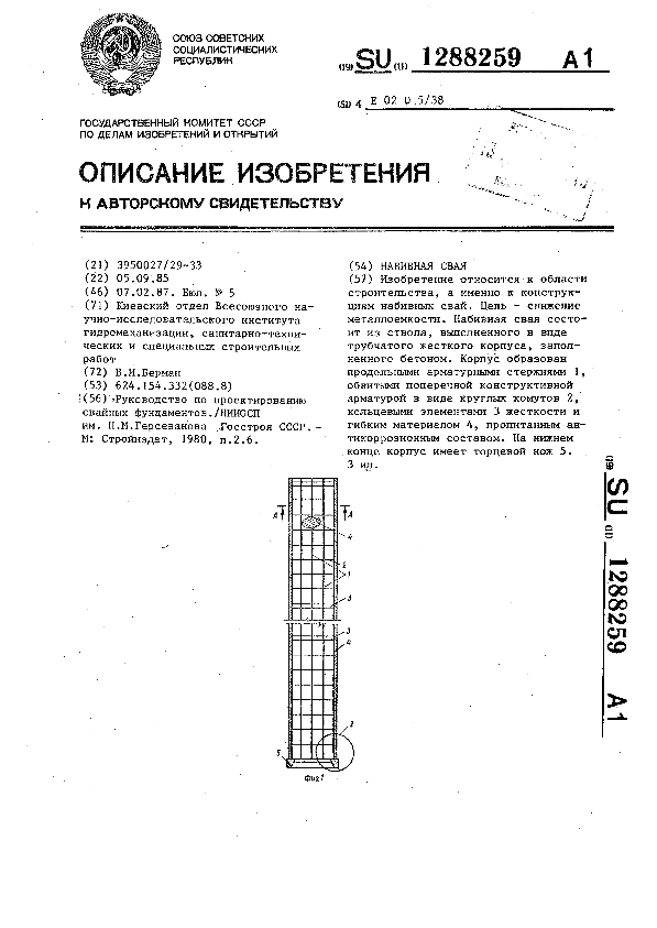 Набивная свая / Берман В. И.; заявитель: Киевский отдел Всесоюзного научно-исследовательского института гидромеханизации, санитарно-технических и специальных строительных работ // Описания изобретений (ретрофонд) / Комитет по патентам и товарным знакам России. – М., 2003. – 1987, № 1. — (Патенты России). — Загл. с титул. экрана. — Поисковая система: MIMOSA GTI. — Систем. требования: Acrobat Reader. — Режим доступа: ftp://smolensklib.ru/bd/patent_ru/pt1288259.pdf. — <URL:ftp://smolensklib.ru/bd/patent_ru/pt1288259.pdf>.