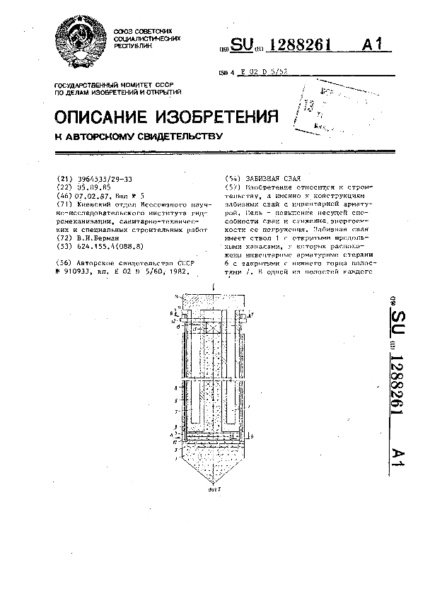 Забивная свая / Берман В. И.; заявитель: Киевский отдел Всесоюзного научно-исследовательского института гидромеханизации, санитарно-технических и специальных строительных работ // Описания изобретений (ретрофонд) / Комитет по патентам и товарным знакам России. – М., 2003. – 1987, № 1. — (Патенты России). — Загл. с титул. экрана. — Поисковая система: MIMOSA GTI. — Систем. требования: Acrobat Reader. — Режим доступа: ftp://smolensklib.ru/bd/patent_ru/pt1288261.pdf. — <URL:ftp://smolensklib.ru/bd/patent_ru/pt1288261.pdf>.