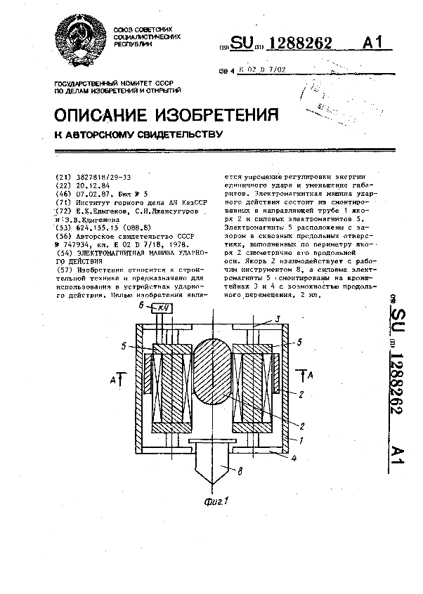 Электромагнитная машина ударного действия / Едыгенов Е. К., Джансугуров С. И., Едыгенова З. В.; заявитель: Институт горного дела АН КазССР // Описания изобретений (ретрофонд) / Комитет по патентам и товарным знакам России. – М., 2003. – 1987, № 1. — (Патенты России). — Загл. с титул. экрана. — Поисковая система: MIMOSA GTI. — Систем. требования: Acrobat Reader. — Режим доступа: ftp://smolensklib.ru/bd/patent_ru/pt1288262.pdf. — <URL:ftp://smolensklib.ru/bd/patent_ru/pt1288262.pdf>.