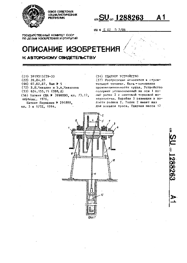 Ударное устройство / Чекалин В. И., Чекалина Э. А. // Описания изобретений (ретрофонд) / Комитет по патентам и товарным знакам России. – М., 2003. – 1987, № 1. — (Патенты России). — Загл. с титул. экрана. — Поисковая система: MIMOSA GTI. — Систем. требования: Acrobat Reader. — Режим доступа: ftp://smolensklib.ru/bd/patent_ru/pt1288263.pdf. — <URL:ftp://smolensklib.ru/bd/patent_ru/pt1288263.pdf>.