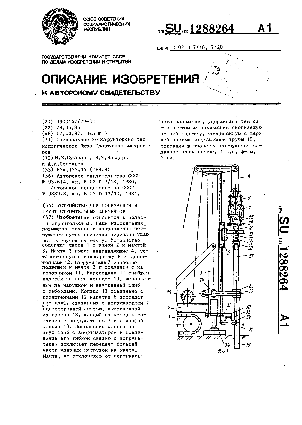 Устройство для погружения в грунт строительных элементов / Сухачев М. З., Бондарь Б. Я., Соловьев А. А.; заявитель: Специальное конструкторско-технологическое бюро Главтоннельметростроя // Описания изобретений (ретрофонд) / Комитет по патентам и товарным знакам России. – М., 2003. – 1987, № 1. — (Патенты России). — Загл. с титул. экрана. — Поисковая система: MIMOSA GTI. — Систем. требования: Acrobat Reader. — Режим доступа: ftp://smolensklib.ru/bd/patent_ru/pt1288264.pdf. — <URL:ftp://smolensklib.ru/bd/patent_ru/pt1288264.pdf>.