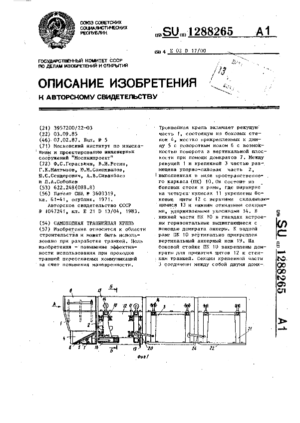 Самоходная траншейная крепь / Гераськин Ф. С., Ресин В. И., Малтызов Г. К. [и др.]; заявитель: Московский институт по изысканиям и проектированию инженерных сооружений "Мосинжпроект" // Описания изобретений (ретрофонд) / Комитет по патентам и товарным знакам России. – М., 2003. – 1987, № 1. — (Патенты России). — Загл. с титул. экрана. — Поисковая система: MIMOSA GTI. — Систем. требования: Acrobat Reader. — Режим доступа: ftp://smolensklib.ru/bd/patent_ru/pt1288265.pdf. — <URL:ftp://smolensklib.ru/bd/patent_ru/pt1288265.pdf>.