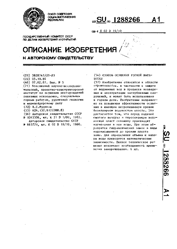 Способ осушения горной выработки / Рудиков В. С.; заявитель: Всесоюзный научно-исследовательский, проектно-конструкторский институт по осушению месторождений полезных ископаемых, специальным горным работам, рудничной геологии и маркшейдерскому делу // Описания изобретений (ретрофонд) / Комитет по патентам и товарным знакам России. – М., 2003. – 1987, № 1. — (Патенты России). — Загл. с титул. экрана. — Поисковая система: MIMOSA GTI. — Систем. требования: Acrobat Reader. — Режим доступа: ftp://smolensklib.ru/bd/patent_ru/pt1288266.pdf. — <URL:ftp://smolensklib.ru/bd/patent_ru/pt1288266.pdf>.