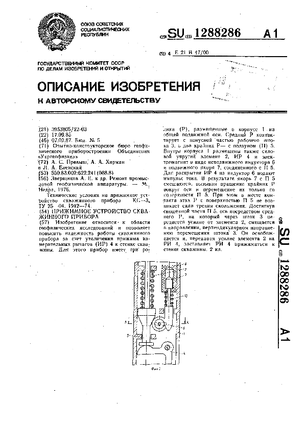 Прижимное устройство скважинного прибора / Превыш А. С., Хирман А. А., Еленский Л. А.; заявитель: Опытно-конструкторское бюро геофизического приборостроения Объединения «Укргеофизика» // Описания изобретений (ретрофонд) / Комитет по патентам и товарным знакам России. – М., 2003. – 1987, № 1. — (Патенты России). — Загл. с титул. экрана. — Поисковая система: MIMOSA GTI. — Систем. требования: Acrobat Reader. — Режим доступа: ftp://smolensklib.ru/bd/patent_ru/pt1288286.pdf. — <URL:ftp://smolensklib.ru/bd/patent_ru/pt1288286.pdf>.
