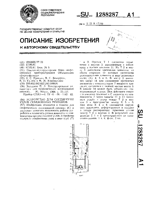 Устройство для соединения узлов скважинных приборов / Превыш А. С., Белорусец В. С., Галета В. О., Коноваленко М. М.; заявитель: Опытно-конструкторское бюро геофизического приборостроения Объединения «Укргеофизика» // Описания изобретений (ретрофонд) / Комитет по патентам и товарным знакам России. – М., 2003. – 1987, № 1. — (Патенты России). — Загл. с титул. экрана. — Поисковая система: MIMOSA GTI. — Систем. требования: Acrobat Reader. — Режим доступа: ftp://smolensklib.ru/bd/patent_ru/pt1288287.pdf. — <URL:ftp://smolensklib.ru/bd/patent_ru/pt1288287.pdf>.
