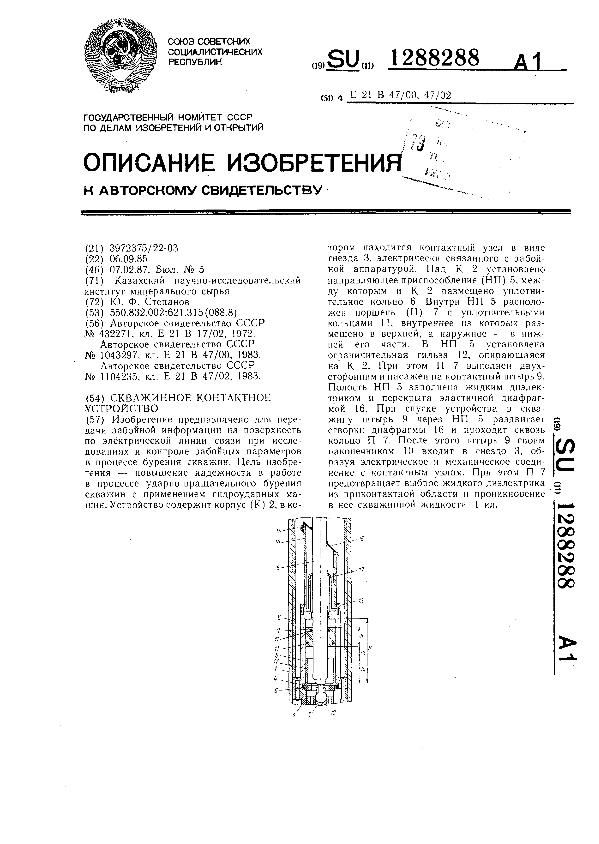 Скважинное контактное устройство / Степанов Ю. Ф.; заявитель: Казахский научно-исследовательский институт минерального сырья // Описания изобретений (ретрофонд) / Комитет по патентам и товарным знакам России. – М., 2003. – 1987, № 1. — (Патенты России). — Загл. с титул. экрана. — Поисковая система: MIMOSA GTI. — Систем. требования: Acrobat Reader. — Режим доступа: ftp://smolensklib.ru/bd/patent_ru/pt1288288.pdf. — <URL:ftp://smolensklib.ru/bd/patent_ru/pt1288288.pdf>.