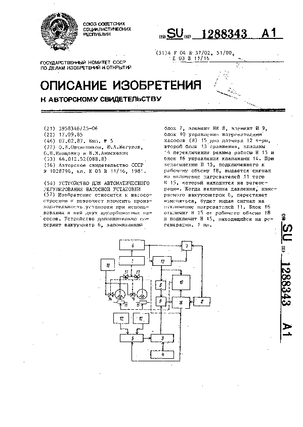 Устройство для автоматического регулирования насосной установки / Овчинников О. В., Жегулов Ю. А., Иващенко О. П., Анискевич В. М. // Описания изобретений (ретрофонд) / Комитет по патентам и товарным знакам России. – М., 2003. – 1987, № 1. — (Патенты России). — Загл. с титул. экрана. — Поисковая система: MIMOSA GTI. — Систем. требования: Acrobat Reader. — Режим доступа: ftp://smolensklib.ru/bd/patent_ru/pt1288343.pdf. — <URL:ftp://smolensklib.ru/bd/patent_ru/pt1288343.pdf>.
