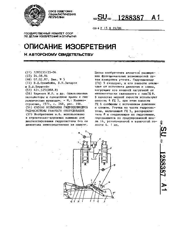 Способ испытания гидроцилиндров гидросистемы рабочего оборудования / Оренбойм Б. Д., Захаров Б. Н., Бирштейн Б. А. // Описания изобретений (ретрофонд) / Комитет по патентам и товарным знакам России. – М., 2003. – 1987, № 1. — (Патенты России). — Загл. с титул. экрана. — Поисковая система: MIMOSA GTI. — Систем. требования: Acrobat Reader. — Режим доступа: ftp://smolensklib.ru/bd/patent_ru/pt1288387.pdf. — <URL:ftp://smolensklib.ru/bd/patent_ru/pt1288387.pdf>.