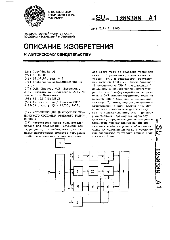 Устройство для диагностики технического состояния объемного гидропривода / Бабаев О. М., Загашвили Ю. В., Игнатов Л. Н. [и др.]; заявитель: Ленинградский механический институт // Описания изобретений (ретрофонд) / Комитет по патентам и товарным знакам России. – М., 2003. – 1987, № 1. — (Патенты России). — Загл. с титул. экрана. — Поисковая система: MIMOSA GTI. — Систем. требования: Acrobat Reader. — Режим доступа: ftp://smolensklib.ru/bd/patent_ru/pt1288388.pdf. — <URL:ftp://smolensklib.ru/bd/patent_ru/pt1288388.pdf>.