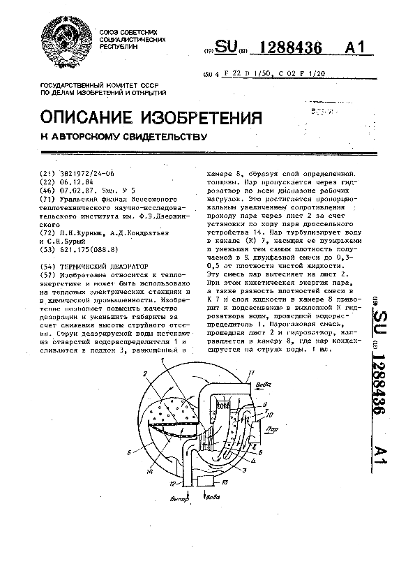 Термический деаэратор / Курнык Л. Н., Кондратьев А. Д., Бурый С. Н.; заявитель: Уральский филиал Всесоюзного теплотехнического научно-исследовательского института им. Ф. Э. Дзержинского // Описания изобретений (ретрофонд) / Комитет по патентам и товарным знакам России. – М., 2003. – 1987, № 1. — (Патенты России). — Загл. с титул. экрана. — Поисковая система: MIMOSA GTI. — Систем. требования: Acrobat Reader. — Режим доступа: ftp://smolensklib.ru/bd/patent_ru/pt1288436.pdf. — <URL:ftp://smolensklib.ru/bd/patent_ru/pt1288436.pdf>.