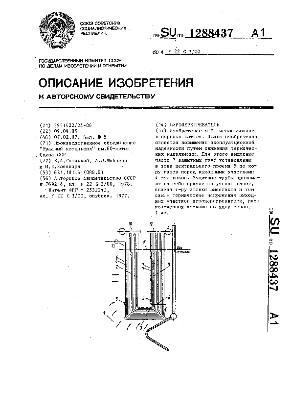 Пароперегреватель / Гатицкий Е. А., Шибалов А. П., Коляндра И. К.; заявитель: Производственное объединение "Красный котельщик" им. 60-летия Союза ССР // Описания изобретений (ретрофонд) / Комитет по патентам и товарным знакам России. – М., 2003. – 1987, № 1. — (Патенты России). — Загл. с титул. экрана. — Поисковая система: MIMOSA GTI. — Систем. требования: Acrobat Reader. — Режим доступа: ftp://smolensklib.ru/bd/patent_ru/pt1288437.pdf. — <URL:ftp://smolensklib.ru/bd/patent_ru/pt1288437.pdf>.