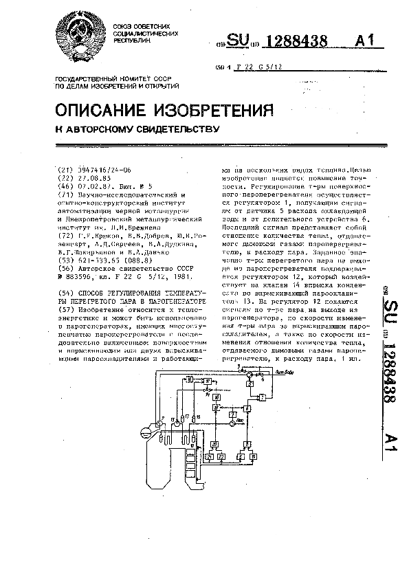 Способ регулирования температуры перегретого пара в парогенераторе / Крюков Г. Я., Добров В. В., Розенгарт Ю. И. [и др.]; заявитель: Научно-исследовательский и опытно-конструкторский институт автоматизации черной металлургии, Днепропетровский металлургический институт им. Л. И. Брежнева // Описания изобретений (ретрофонд) / Комитет по патентам и товарным знакам России. – М., 2003. – 1987, № 1. — (Патенты России). — Загл. с титул. экрана. — Поисковая система: MIMOSA GTI. — Систем. требования: Acrobat Reader. — Режим доступа: ftp://smolensklib.ru/bd/patent_ru/pt1288438.pdf. — <URL:ftp://smolensklib.ru/bd/patent_ru/pt1288438.pdf>.