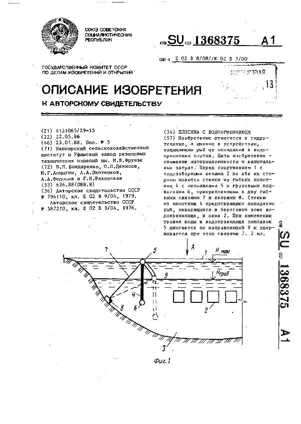 Плотина с водоприемником / Бондаренко В. Л., Денисов О. Л., Анцыгин Ю. Г. [и др.]; заявитель: Башкирский сельскохозяйственный институт, Уфимский завод резиновых технических изделий им. М. В. Фрунзе // Описания изобретений (ретрофонд) / Комитет по патентам и товарным знакам России. — М., 1994-____. — (Патенты России). – 1988, № 1. — Загл. с титул. экрана. — Поисковая система: ИПС MIMOSA GTI. — Систем. требования: Acrobat Reader. — Режим доступа: ftp://smolensklib.ru/bd/patent_ru/pt1368375.pdf. — <URL:ftp://smolensklib.ru/bd/patent_ru/pt1368375.pdf>.