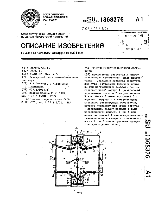 Понтон гидротехнического сооружения / Лемешев А. И., Гайнанов Д. А., Лемешева Э. П.; заявитель: Башкирский сельскохозяйственный институт // Описания изобретений (ретрофонд) / Комитет по патентам и товарным знакам России. — М., 1994-____. — (Патенты России). – 1988, № 1. — Загл. с титул. экрана. — Поисковая система: ИПС MIMOSA GTI. — Систем. требования: Acrobat Reader. — Режим доступа: ftp://smolensklib.ru/bd/patent_ru/pt1368376.pdf. — <URL:ftp://smolensklib.ru/bd/patent_ru/pt1368376.pdf>.