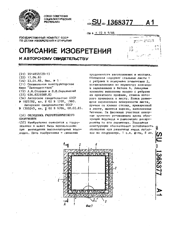 Облицовка гидротехнического сооружения / Старцев А. М., Перельштейн Л. И.; заявитель: Специальное конструкторское бюро "Ленгидросталь" // Описания изобретений (ретрофонд) / Комитет по патентам и товарным знакам России. — М., 1994-____. — (Патенты России). – 1988, № 1. — Загл. с титул. экрана. — Поисковая система: ИПС MIMOSA GTI. — Систем. требования: Acrobat Reader. — Режим доступа: ftp://smolensklib.ru/bd/patent_ru/pt1368377.pdf. — <URL:ftp://smolensklib.ru/bd/patent_ru/pt1368377.pdf>.