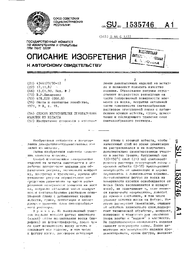 Способ изготовления декоративных изделий из металла / Назаренко В. Р. // Описания изобретений (ретрофонд) / Комитет по патентам и товарным знакам России. – М., 2003. – 1990, № 1. — (Патенты России). — Загл. с титул. экрана. — Поисковая система: MIMOSA GTI. — Систем. требования: Acrobat Reader. — Режим доступа: ftp://smolensklib.ru/bd/patent_ru/pt1535746.pdf. — <URL:ftp://smolensklib.ru/bd/patent_ru/pt1535746.pdf>.
