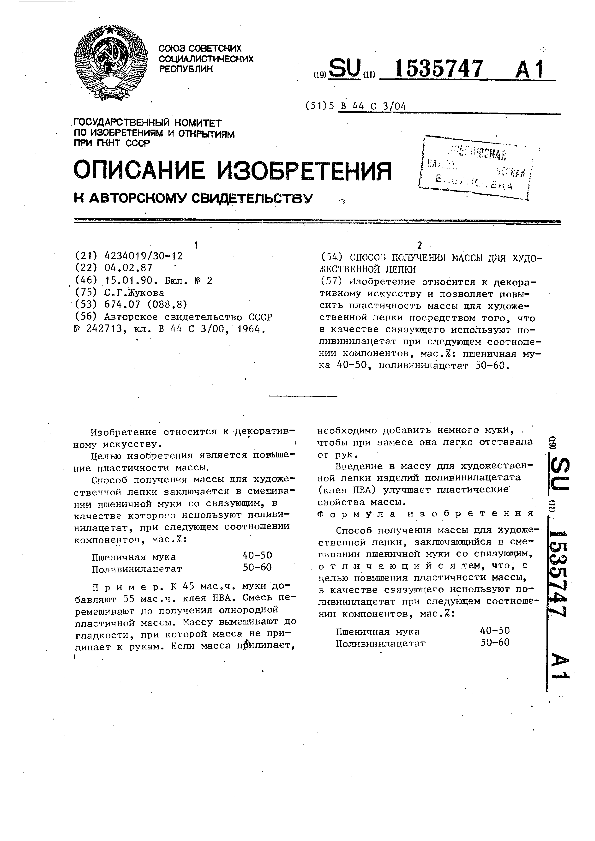 Способ получения массы для художественной лепки / Жукова С. Г. // Описания изобретений (ретрофонд) / Комитет по патентам и товарным знакам России. – М., 2003. – 1990, № 1. — (Патенты России). — Загл. с титул. экрана. — Поисковая система: MIMOSA GTI. — Систем. требования: Acrobat Reader. — Режим доступа: ftp://smolensklib.ru/bd/patent_ru/pt1535747.pdf. — <URL:ftp://smolensklib.ru/bd/patent_ru/pt1535747.pdf>.