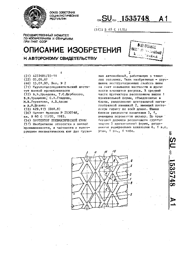 Протектор пневматической шины / Дроздова В. В., Щербакова Т. С., Пращикин В. Н. [и др.]; заявитель: Научно-исследовательский институт шинной промышленности // Описания изобретений (ретрофонд) / Комитет по патентам и товарным знакам России. – М., 2003. – 1990, № 1. — (Патенты России). — Загл. с титул. экрана. — Поисковая система: MIMOSA GTI. — Систем. требования: Acrobat Reader. — Режим доступа: ftp://smolensklib.ru/bd/patent_ru/pt1535748.pdf. — <URL:ftp://smolensklib.ru/bd/patent_ru/pt1535748.pdf>.