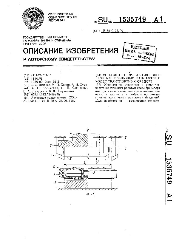 Устройство для снятия изношенных резиновых бандажей с колес транспортных средств / Ширяев С. С., Халин Н. И., Худолий А. И. [и др.] // Описания изобретений (ретрофонд) / Комитет по патентам и товарным знакам России. – М., 2003. – 1990, № 1. — (Патенты России). — Загл. с титул. экрана. — Поисковая система: MIMOSA GTI. — Систем. требования: Acrobat Reader. — Режим доступа: ftp://smolensklib.ru/bd/patent_ru/pt1535749.pdf. — <URL:ftp://smolensklib.ru/bd/patent_ru/pt1535749.pdf>.