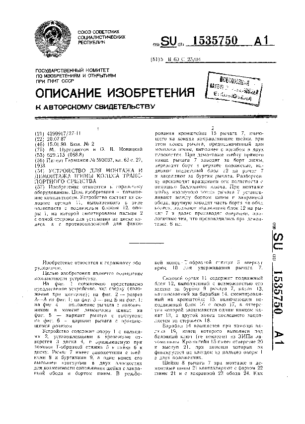 Устройство для монтажа и демонтажа шины колеса транспортного средства / Нургалимов М., Новицкий О. В. // Описания изобретений (ретрофонд) / Комитет по патентам и товарным знакам России. – М., 2003. – 1990, № 1. — (Патенты России). — Загл. с титул. экрана. — Поисковая система: MIMOSA GTI. — Систем. требования: Acrobat Reader. — Режим доступа: ftp://smolensklib.ru/bd/patent_ru/pt1535750.pdf. — <URL:ftp://smolensklib.ru/bd/patent_ru/pt1535750.pdf>.