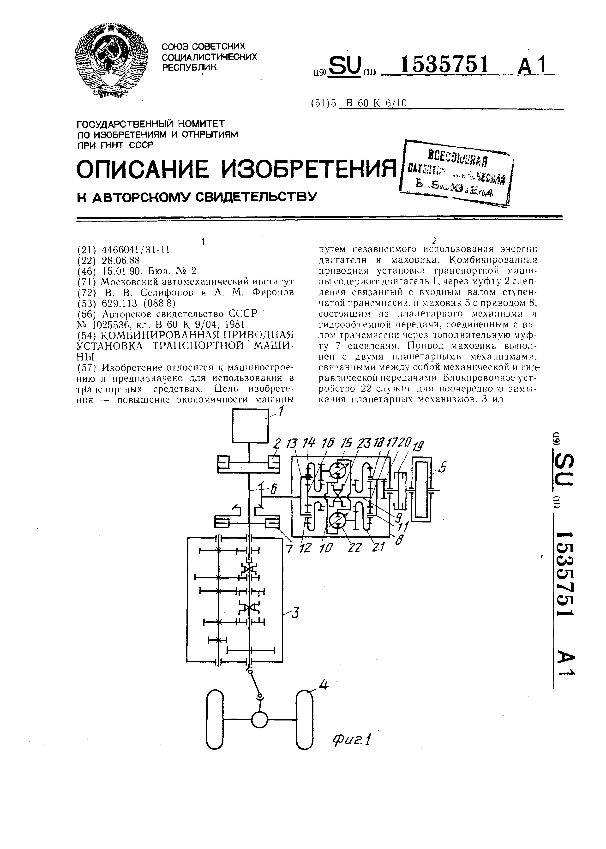 Комбинированная приводная установка транспортной машины / Селифонов В. В., Фиронов А. М.; заявитель: Московский автомеханический институт // Описания изобретений (ретрофонд) / Комитет по патентам и товарным знакам России. – М., 2003. – 1990, № 1. — (Патенты России). — Загл. с титул. экрана. — Поисковая система: MIMOSA GTI. — Систем. требования: Acrobat Reader. — Режим доступа: ftp://smolensklib.ru/bd/patent_ru/pt1535751.pdf. — <URL:ftp://smolensklib.ru/bd/patent_ru/pt1535751.pdf>.