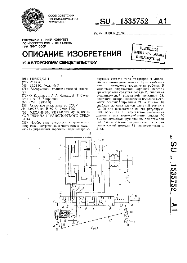 Механизм управления коробкой передач транспортного средства / Довнар О. К., Черкас А. А., Скойбеда А. Т., Бобровник А. И.; заявитель: Белорусский политехнический институт // Описания изобретений (ретрофонд) / Комитет по патентам и товарным знакам России. – М., 2003. – 1990, № 1. — (Патенты России). — Загл. с титул. экрана. — Поисковая система: MIMOSA GTI. — Систем. требования: Acrobat Reader. — Режим доступа: ftp://smolensklib.ru/bd/patent_ru/pt1535752.pdf. — <URL:ftp://smolensklib.ru/bd/patent_ru/pt1535752.pdf>.