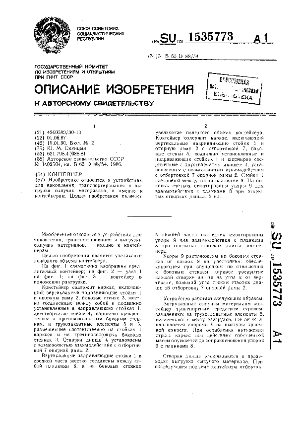 Контейнер / Синицын Ю. М. // Описания изобретений (ретрофонд) / Комитет по патентам и товарным знакам России. – М., 2003. – 1990, 1. — (Патенты России). — Загл. с титул. экрана. — Поисковая система: MIMOSA GTI. — Систем. требования: Acrobat Reader. — Режим доступа: ftp://smolensklib.ru/bd/patent_ru/pt1535773.pdf. — <URL:ftp://smolensklib.ru/bd/patent_ru/pt1535773.pdf>.