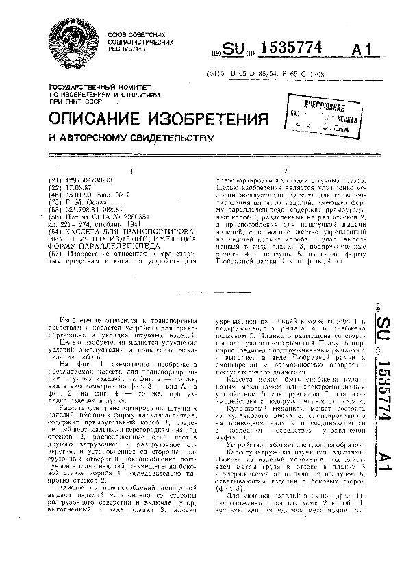 Кассета для транспортирования штучных изделий, имеющих форму параллелепипеда / Оснач Г. М. // Описания изобретений (ретрофонд) / Комитет по патентам и товарным знакам России. – М., 2003. – 1990, 1. — (Патенты России). — Загл. с титул. экрана. — Поисковая система: MIMOSA GTI. — Систем. требования: Acrobat Reader. — Режим доступа: ftp://smolensklib.ru/bd/patent_ru/pt1535774.pdf. — <URL:ftp://smolensklib.ru/bd/patent_ru/pt1535774.pdf>.