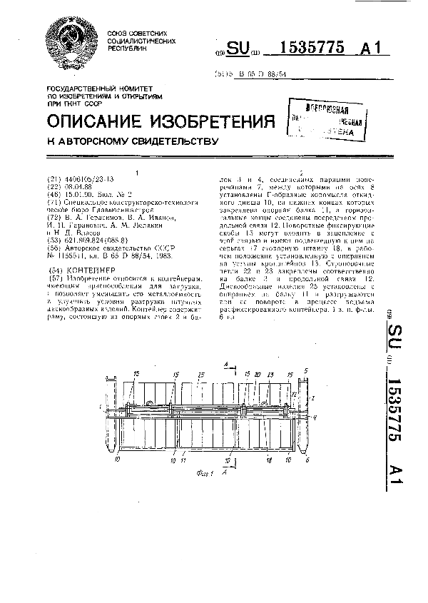 Контейнер / Герасимов В. А., Иванов В. А., Гаранович И. Н. [и др.]; заявитель: Специальное конструкторско-технологическое бюро Главмосинжстроя // Описания изобретений (ретрофонд) / Комитет по патентам и товарным знакам России. – М., 2003. – 1990, 1. — (Патенты России). — Загл. с титул. экрана. — Поисковая система: MIMOSA GTI. — Систем. требования: Acrobat Reader. — Режим доступа: ftp://smolensklib.ru/bd/patent_ru/pt1535775.pdf. — <URL:ftp://smolensklib.ru/bd/patent_ru/pt1535775.pdf>.