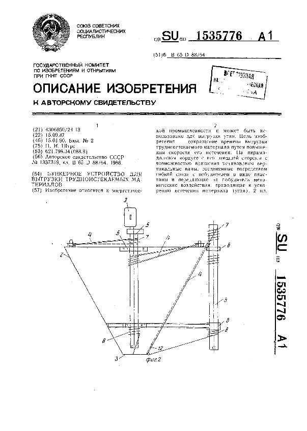 Бункерное устройство для выгрузки трудноистекаемых материалов / Штро П. Н. // Описания изобретений (ретрофонд) / Комитет по патентам и товарным знакам России. – М., 2003. – 1990, 1. — (Патенты России). — Загл. с титул. экрана. — Поисковая система: MIMOSA GTI. — Систем. требования: Acrobat Reader. — Режим доступа: ftp://smolensklib.ru/bd/patent_ru/pt1535776.pdf. — <URL:ftp://smolensklib.ru/bd/patent_ru/pt1535776.pdf>.