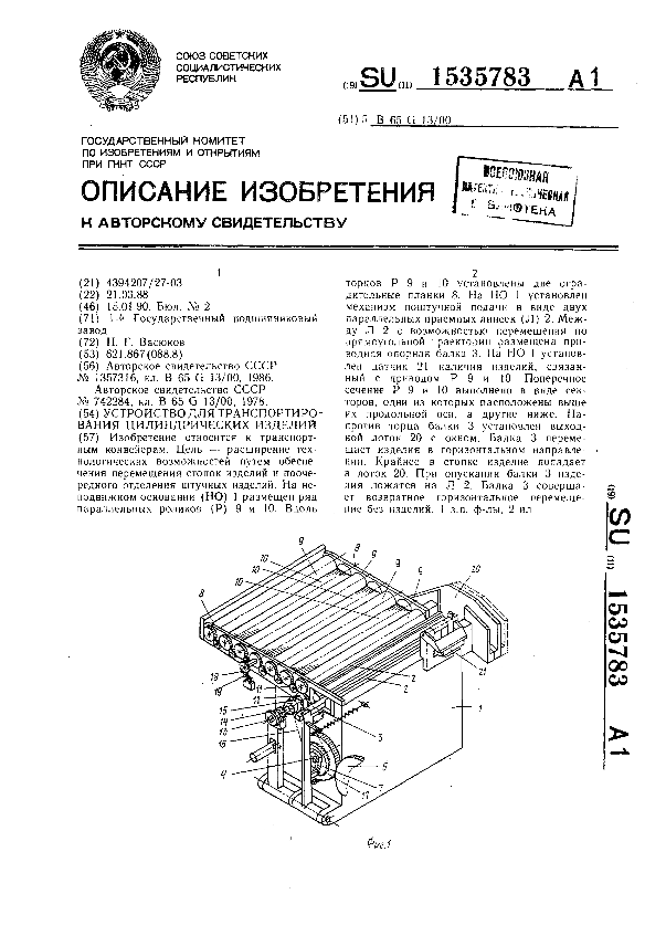 Устройство для транспортирования цилиндрических изделий / Васюков Н. Г.; заявитель: 1-й Государственный подшипниковый завод // Описания изобретений (ретрофонд) / Комитет по патентам и товарным знакам России. – М., 2003. – 1990, 1. — (Патенты России). — Загл. с титул. экрана. — Поисковая система: MIMOSA GTI. — Систем. требования: Acrobat Reader. — Режим доступа: ftp://smolensklib.ru/bd/patent_ru/pt1535783.pdf. — <URL:ftp://smolensklib.ru/bd/patent_ru/pt1535783.pdf>.