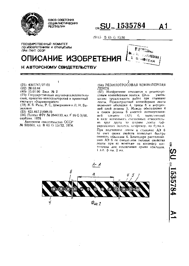 Резинотросовая конвейерная лента / Риза В. Б., Шмеркович Р. С., Базилевич Л. Н.; заявитель: Государственный научно-исследовательский, проектно-конструкторский и проектный институт «Укрниипроект» // Описания изобретений (ретрофонд) / Комитет по патентам и товарным знакам России. – М., 2003. – 1990, 1. — (Патенты России). — Загл. с титул. экрана. — Поисковая система: MIMOSA GTI. — Систем. требования: Acrobat Reader. — Режим доступа: ftp://smolensklib.ru/bd/patent_ru/pt1535784.pdf. — <URL:ftp://smolensklib.ru/bd/patent_ru/pt1535784.pdf>.