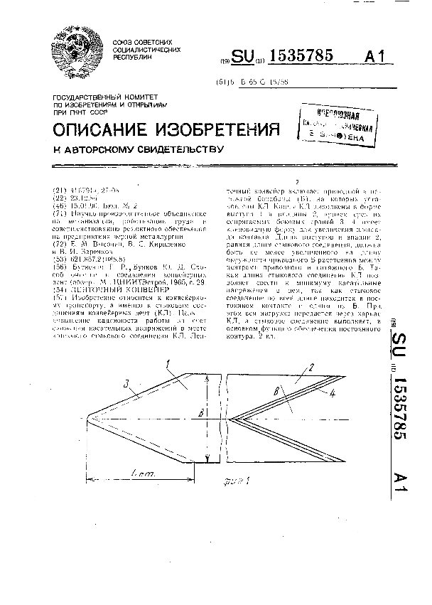 Ленточный конвейер / Высочин Е. М., Кириленко В. С., Заренков В. И.; заявитель: Научно-производственное объединение по механизации, роботизации труда и совершенствованию ремонтного обеспечения на предприятиях черной металлургии // Описания изобретений (ретрофонд) / Комитет по патентам и товарным знакам России. – М., 2003. – 1990, 1. — (Патенты России). — Загл. с титул. экрана. — Поисковая система: MIMOSA GTI. — Систем. требования: Acrobat Reader. — Режим доступа: ftp://smolensklib.ru/bd/patent_ru/pt1535785.pdf. — <URL:ftp://smolensklib.ru/bd/patent_ru/pt1535785.pdf>.