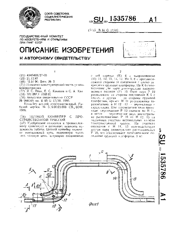 Цепной конвейер с пространственной трассой / Рева Я. С., Кокизов Е. С., Хан С. А.; заявитель: Проектно-конструкторский институт конвейеростроения // Описания изобретений (ретрофонд) / Комитет по патентам и товарным знакам России. – М., 2003. – 1990, 1. — (Патенты России). — Загл. с титул. экрана. — Поисковая система: MIMOSA GTI. — Систем. требования: Acrobat Reader. — Режим доступа: ftp://smolensklib.ru/bd/patent_ru/pt1535786.pdf. — <URL:ftp://smolensklib.ru/bd/patent_ru/pt1535786.pdf>.