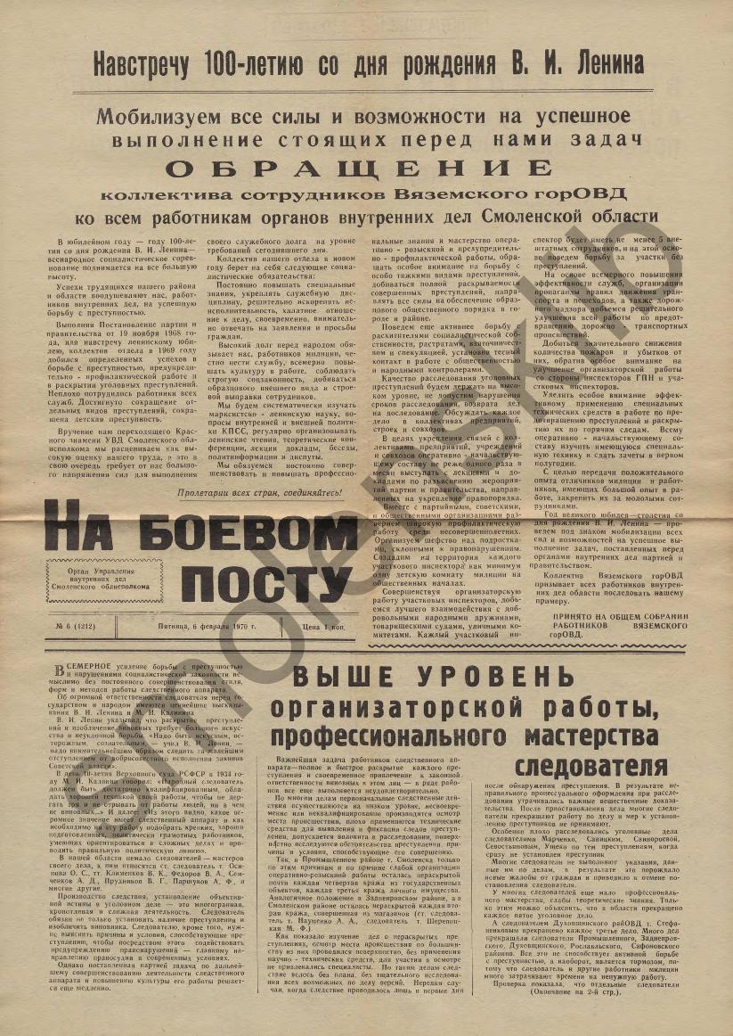 На боевом посту: Орган управления внутренних дел Смоленского облисполкома. — Смоленск: Смолгортип., 1946-____. № 6.