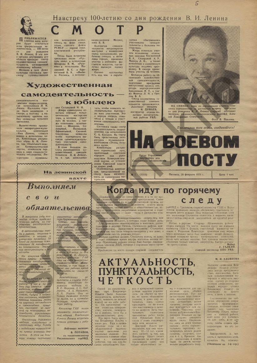 На боевом посту: Орган управления внутренних дел Смоленского облисполкома. — Смоленск: Смолгортип., 1946-____. № 7.