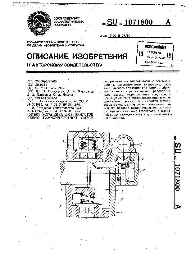 Установка для приготовления газожидкостной смеси / Поздняков Ю. Н., Чикирисов А. А., Лавров В. А., Лезгин Л. А. // Описания изобретений (ретрофонд) / Комитет по патентам и товарным знакам России. – М. — (Патенты России)., 2003. – 1984, № 1. — Загл. с титул. экрана. — Поисковая система: ИПС MIMOSA GTI. — Систем. требования: Acrobat Reader. — Режим доступа: ftp://smolensklib.ru/bd/patent_ru/pt1071800.pdf. — <URL:ftp://smolensklib.ru/bd/patent_ru/pt1071800.pdf>.