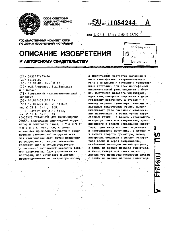 Установка для производства озона / Агафонов Ю. П., Васильев В. А., Маер Э. Ф.; заявитель : Курганский машиностроительный институт // Описания изобретений (ретрофонд) / Комитет по патентам и товарным знакам России. – М. — (Патенты России)., 2003. – 1984, № 1. — Загл. с титул. экрана. — Поисковая система: ИПС MIMOSA GTI. — Систем. требования: Acrobat Reader. — Режим доступа: ftp://smolensklib.ru/bd/patent_ru/pt1084244.pdf. — <URL:ftp://smolensklib.ru/bd/patent_ru/pt1084244.pdf>.