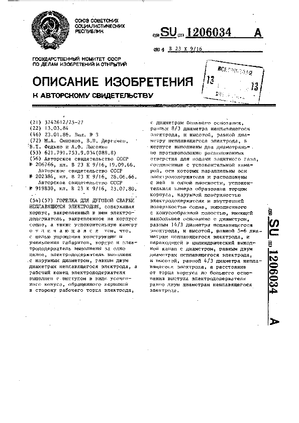 Горелка для дуговой сварки неплавящимся электродом / Смирнов М. А., Дергачев В. П., Федько В. Т. [ и др.] // Описания изобретений (ретрофонд) / Комитет по патентам и товарным знакам России. – М., 2003. – 1986, № 1. — (Патенты России). — Загл. с титул. экрана. — Систем. требования: Acrobat Reader. — Режим доступа: ftp://smolensklib.ru/bd/patent_ru/pt1206034.pdf. — <URL:ftp://smolensklib.ru/bd/patent_ru/pt1206034.pdf>.